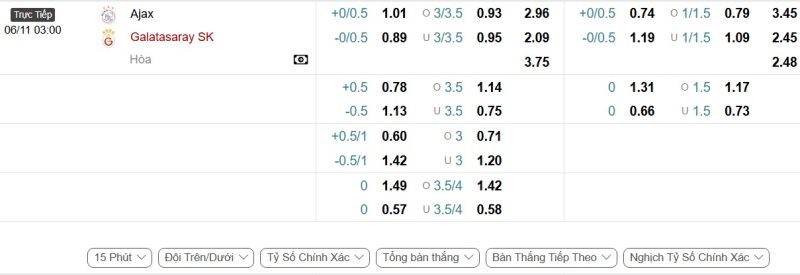 - Kèo tỷ số bóng đá hiệp 1: Ajax 1-2 Galatasaray