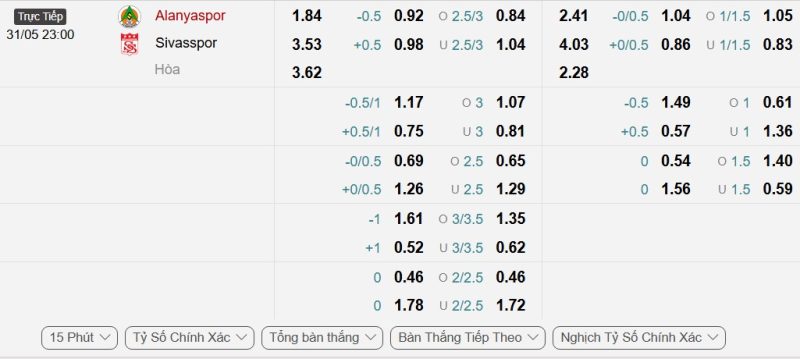 - Kèo tỷ số bóng đá hiệp 1: Alanyaspor 0-0 Sivasspor