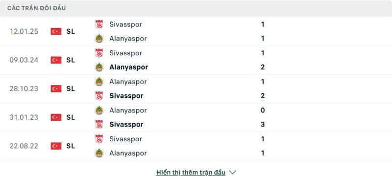 Thành tích đối đầu của Alanyaspor vs Sivasspor