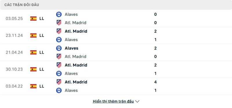 Thành tích đối đầu của Alavés vs Atlético Madrid