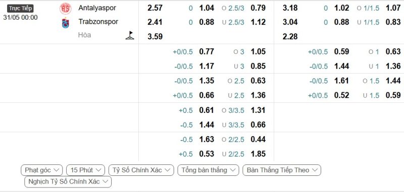 Trong 45 phút đầu tiên, Antalyaspor được kỳ vọng sẽ tận dụng sự lơi lỏng của hàng thủ Trabzonspor để ghi bàn mở tỉ số. Một pha dàn xếp đơn giản nhưng hiệu quả có thể là bước ngoặt. Sau bàn thắng này, thế trận trở nên giằng co, Trabzonspor dù kiểm soát nhiều bóng nhưng không tạo ra cơ hội thực sự rõ rệt. Mức kèo tài xỉu mà nhà cái niêm yết là 1.25 với tỷ lệ cho tài là 1.07, tỷ lệ cho xỉu là 0.83, người chơi nên đặt niềm tin vào cửa xỉu cho hiệp đấu này.