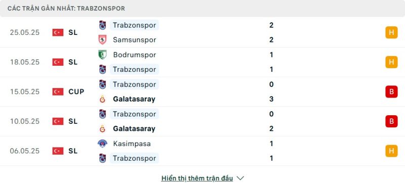 5 trận gần nhất của Trabzonspor: D-D-L-L-D