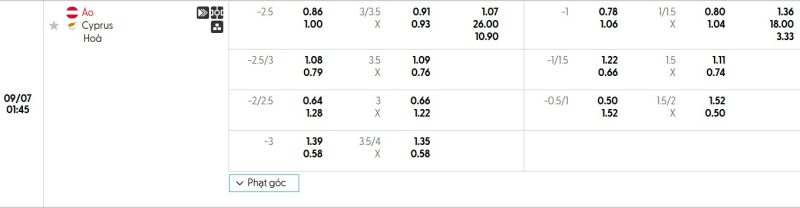 - Kèo tỷ số bóng đá hiệp 1: Áo 2-0 Đảo Síp
