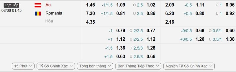 Bảng Tỷ lệ kèo bóng đá Áo vs Romania