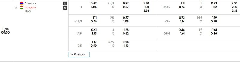 Bảng Tỷ lệ kèo bóng đá Armenia vs Hungary