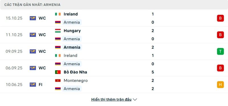 5 trận gần nhất của Armenia: L-L-W-L-D