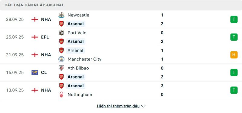 5 trận gần nhất của Arsenal: W-W-D-W-W