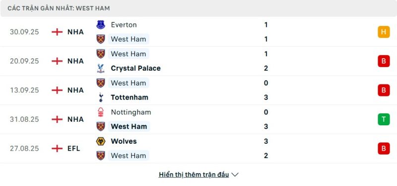 5 trận gần nhất của West Ham United: D-L-L-W-L