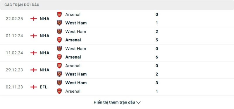 Thống kê phong độ gần đây Arsenal vs West Ham United