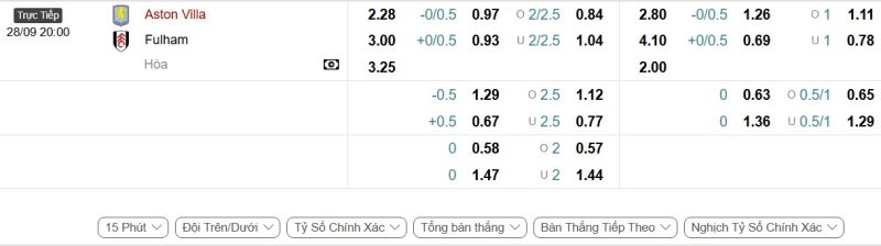 Bảng Tỷ lệ kèo bóng đá Aston Villa vs Fulham