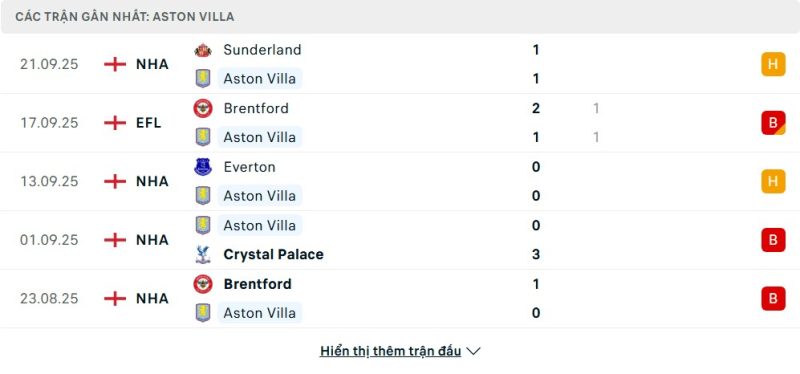 Aston Villa đang trải qua một khởi đầu khó khăn tại Ngoại hạng Anh khi chưa có chiến thắng nào sau 5 vòng đấu. Họ hòa 3 và thua 2, ghi được vỏn vẹn 1 bàn thắng, đồng thời phải nhận tới 5 bàn thua, qua đó chỉ đứng trong nhóm cuối bảng. Gần đây, đội bóng của Unai Emery đã cầm hòa Sunderland và Everton, nhưng lại thất bại đáng tiếc trước Crystal Palace và Brentford. Dù từng thể hiện phong độ tích cực ở loạt trận giao hữu mùa hè, nhưng Aston Villa vẫn chưa tìm lại sự tự tin và tính hiệu quả tại đấu trường quốc nội.
