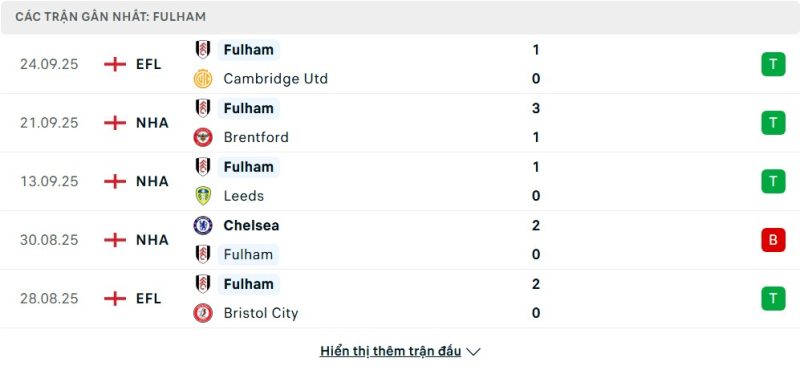 Fulham đang có phong độ khá ấn tượng với nhiều kết quả tích cực. Sau 5 vòng, họ thắng 2, hòa 2 và chỉ thua 1, hiện đang đứng ở nửa trên bảng xếp hạng. Đặc biệt, chiến thắng trước Brentford và Leeds đã giúp đội bóng của Marco Silva củng cố sự tự tin. Ở cúp Liên đoàn, Fulham cũng lần lượt vượt qua Bristol City và Cambridge để tiến sâu hơn. Hàng công của họ đang dần vào guồng, trong khi tuyến phòng ngự có sự chắc chắn đáng kể. Sự ổn định trong cách chơi hiện tại giúp Fulham trở thành một đối thủ đáng gờm với bất kỳ đội bóng nào.