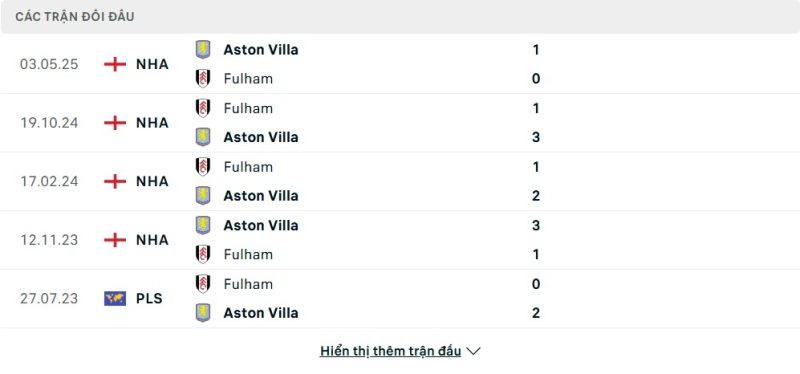 Thành tích đối đầu của Aston Villa vs Fulham