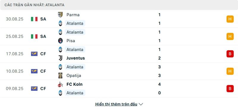 Thống kê phong độ gần đây Atalanta vs Lecce