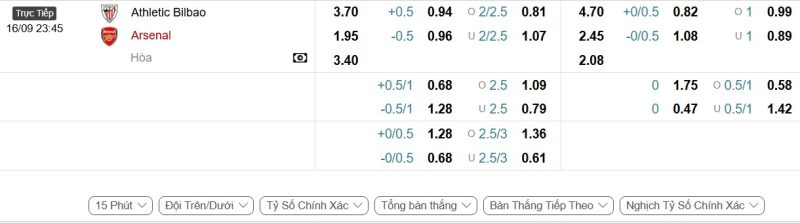 Bảng Tỷ lệ kèo bóng đá Athletic Bilbao vs Arsenal