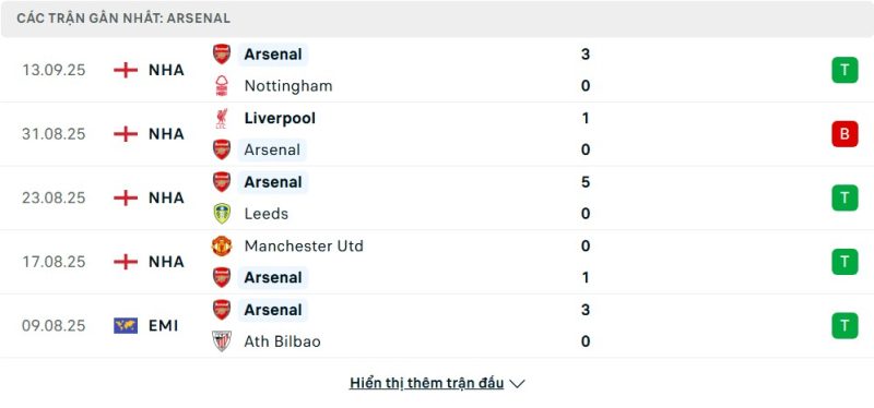 5 trận gần nhất của Arsenal: W-L-W-W-W