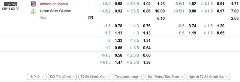 Bảng Tỷ lệ kèo bóng đá Atlético Madrid vs Union Saint-Gilloise