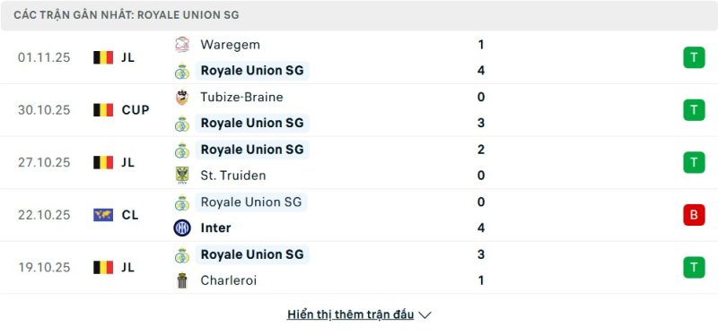 5 trận gần nhất của Union Saint-Gilloise: W-W-W-L-W