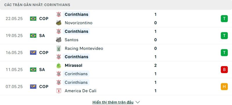 5 trận gần nhất của Corinthians: W-W-W-L-D