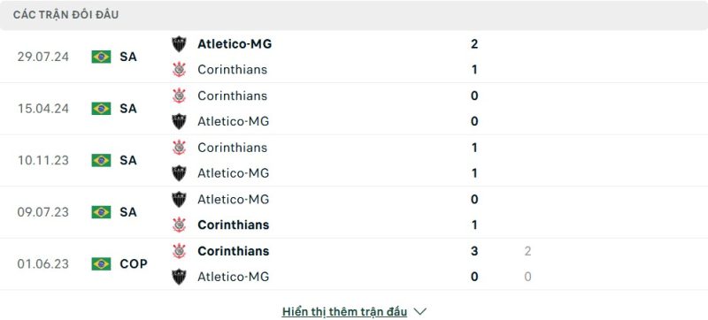 Thành tích đối đầu của Atlético Mineiro vs Corinthians
