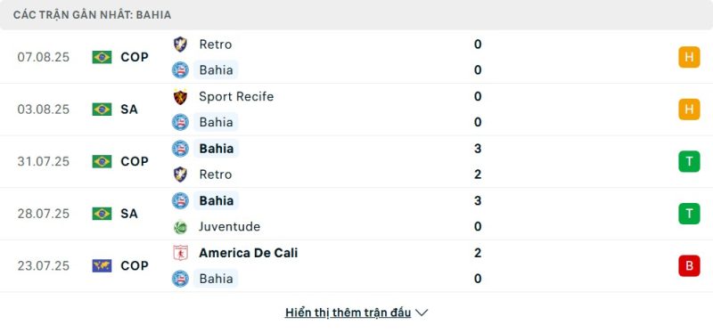 Bahia đang thể hiện phong độ ổn định với chuỗi 4 trận bất bại liên tiếp trên mọi đấu trường. Họ đã vượt qua Retro 3-2 ở lượt đi cúp quốc gia và tiếp tục giành chiến thắng 3-0 trước Juventude trong khuôn khổ giải VĐQG. Dù hai trận gần nhất chỉ hòa không bàn thắng với Sport Recife và Retro ở lượt về, Bahia vẫn cho thấy sự chắc chắn trong hệ thống phòng ngự. Những kết quả gần đây phản ánh một Bahia giàu kỷ luật, khó bị đánh bại, đặc biệt khi được chơi trên sân nhà.