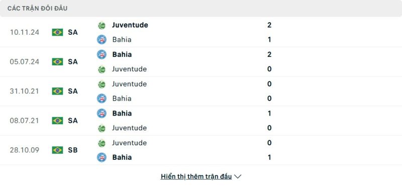 Thành tích đối đầu của Bahia vs Juventude