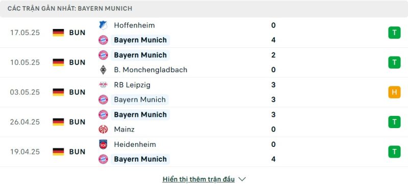 5 trận gần nhất của Bayern Munich: W-W-D-W-W