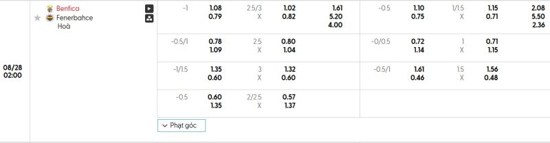 Bảng Tỷ lệ kèo bóng đá Benfica vs Fenerbahçe