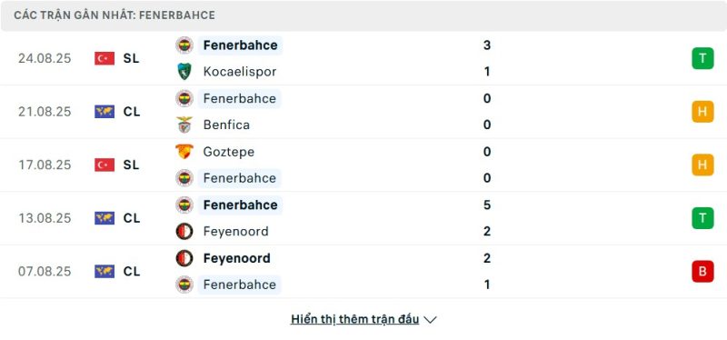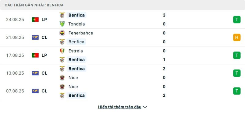Thống kê phong độ gần đây Benfica vs Fenerbahçe