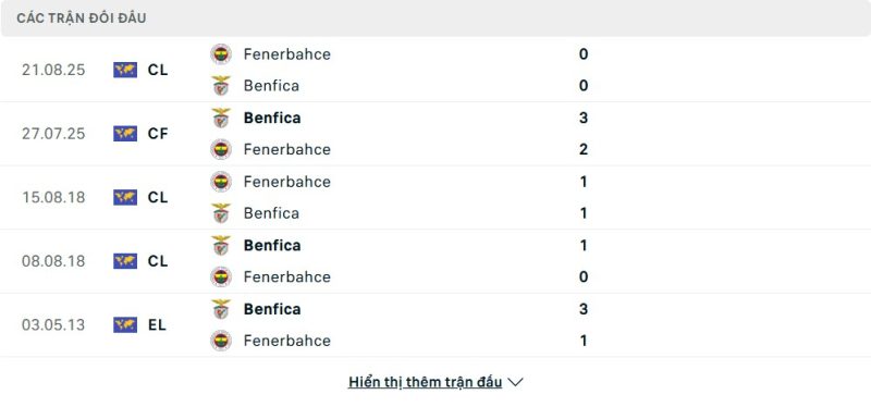 Thành tích đối đầu của Benfica vs Fenerbahçe