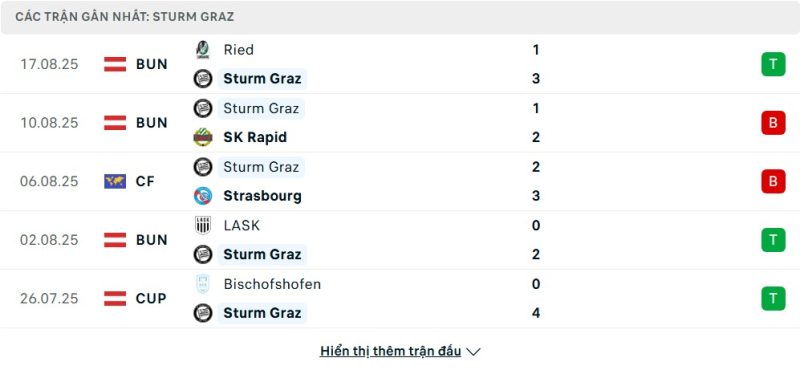 5 trận gần nhất của Sturm Graz: W-L-L-W-W