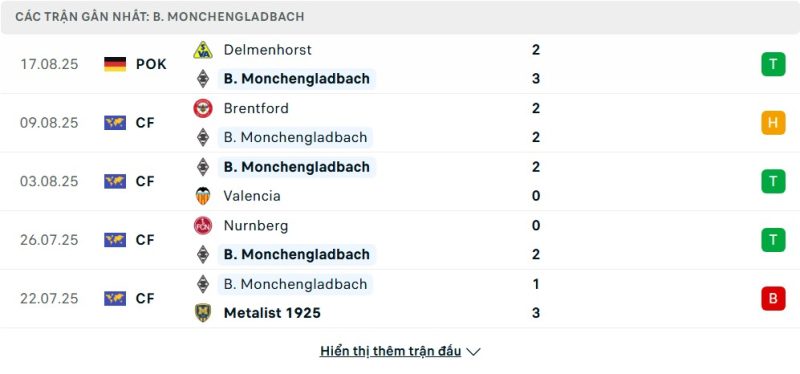 5 trận gần nhất của Borussia Mönchengladbach: W-D-W-W-L
