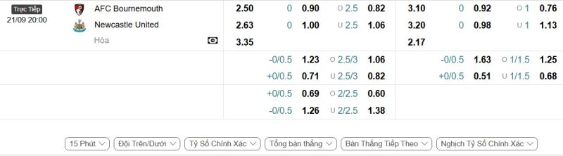 Bảng Tỷ lệ kèo bóng đá Bournemouth vs Newcastle United