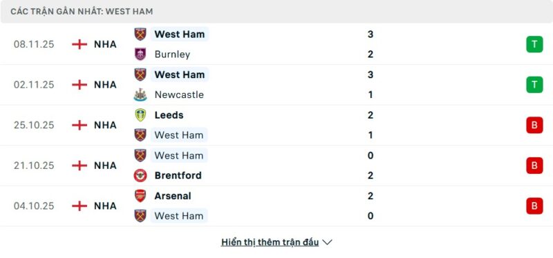 5 trận gần nhất của West Ham United: W-W-L-L-L