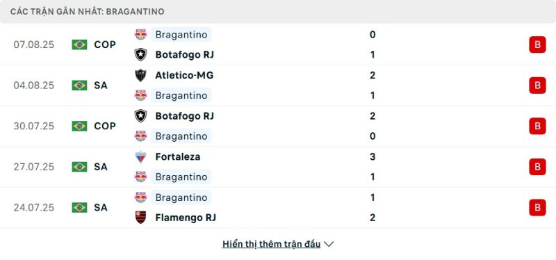 5 trận gần nhất của Red Bull Bragantino: L-L-L-L-L