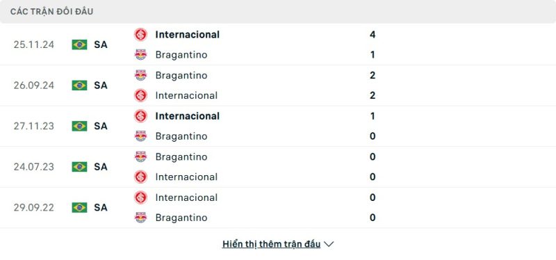 Thành tích đối đầu của Red Bull Bragantino vs Internacional