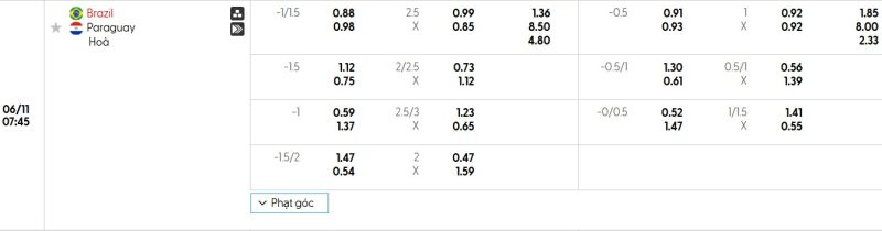 Bảng Tỷ lệ kèo bóng đá Brazil vs Paraguay