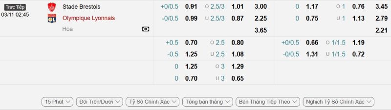 • Kèo tỷ số Full Time: Brest 2-3 Lyon