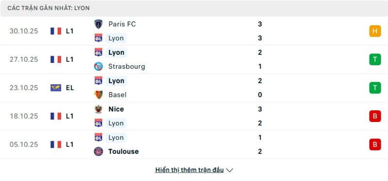 5 trận gần nhất của Lyon: D-W-W-L-L