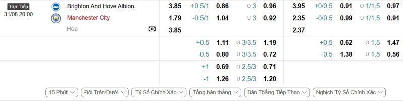 - Kèo tỷ số bóng đá hiệp 1: Brighton & Hove Albion 0-1 Manchester City