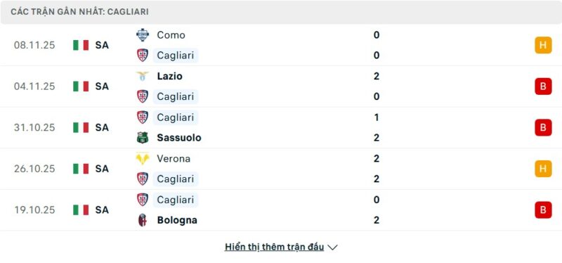 5 trận gần nhất của Cagliari: D-L-L-D-L