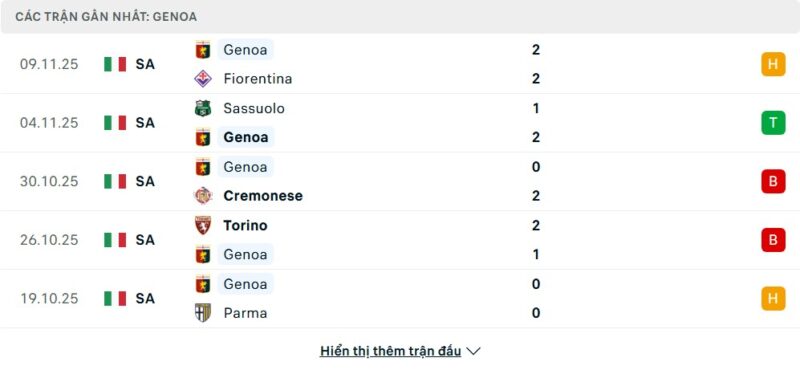 5 trận gần nhất của Genoa: D-W-L-L-D