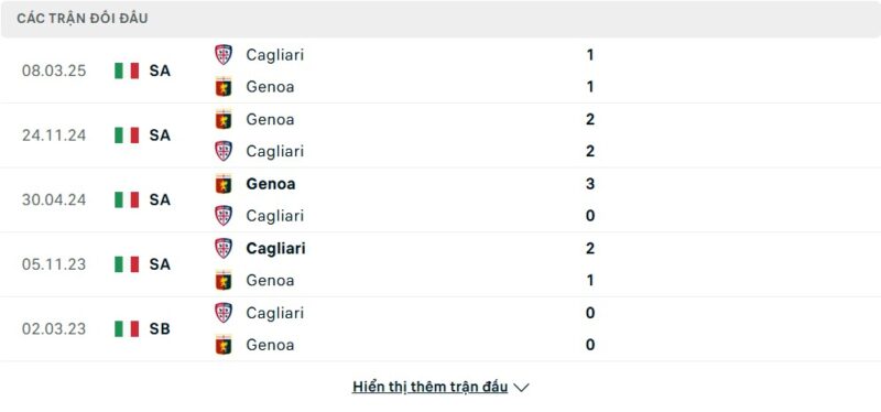 Thống kê phong độ gần đây Cagliari vs Genoa