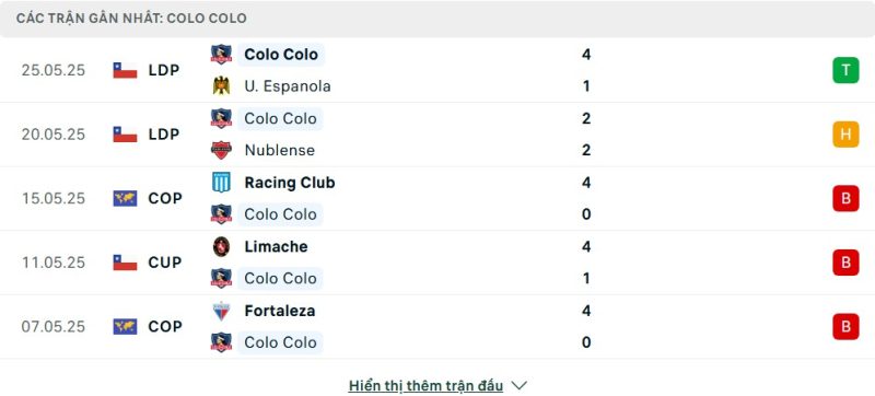 5 trận gần nhất của Colo Colo: W-D-L-L-L