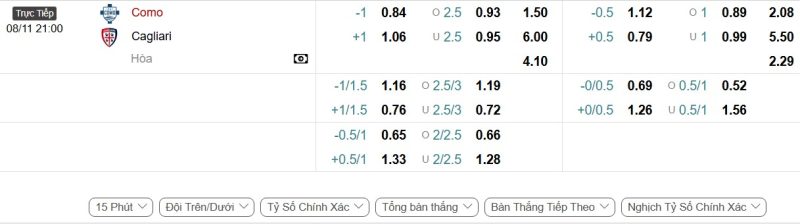 Bảng Tỷ lệ kèo bóng đá Como vs Cagliari