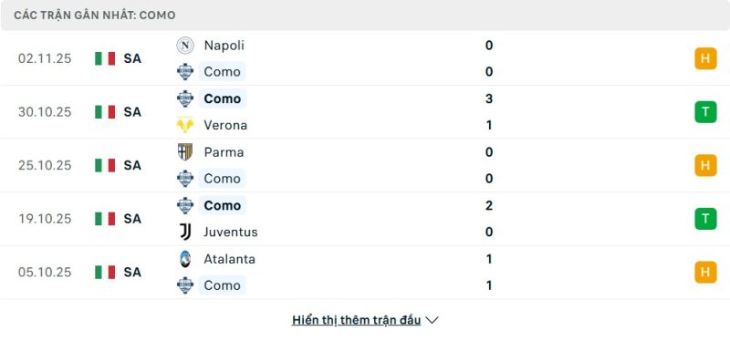 Como đang có một khởi đầu mùa giải ấn tượng, đặc biệt là khi được thi đấu trên sân nhà Stadio Giuseppe Sinigaglia. Dưới sự dẫn dắt của HLV Cesc Fàbregas, họ đang sở hữu chuỗi 9 trận bất bại liên tiếp trên mọi đấu trường. Phong độ của Como tại Serie A là rất thuyết phục, bao gồm chiến thắng oanh liệt 2-0 trước Juventus, trận thắng 3-1 ấn tượng trước Verona và gần đây nhất là cầm hòa 0-0 với đội đầu bảng Napoli. Với sự tự tin lên cao, Como đang là một thế lực đáng gờm tại tổ ấm của mình.