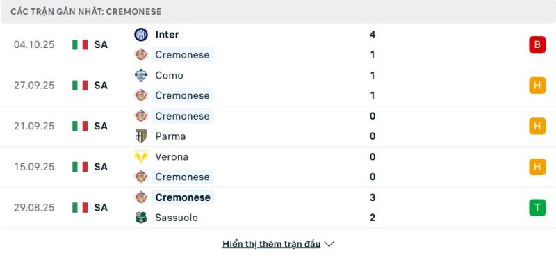 - Phong độ của Cremonese