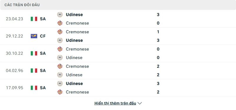 Thành tích đối đầu của Cremonese vs Udinese