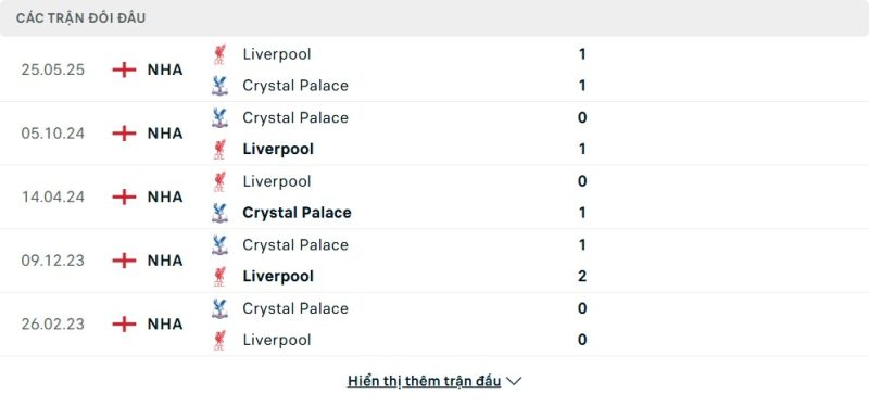 Thành tích đối đầu của Crystal Palace vs Liverpool