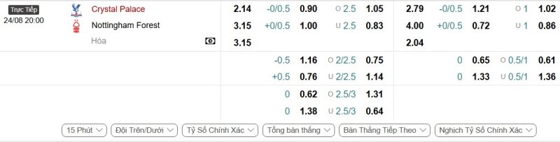 Bảng Tỷ lệ kèo bóng đá Crystal Palace vs Nottingham Forest